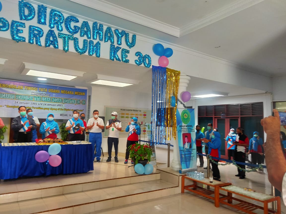 Pengadilan Tinggi TUN Medan, Jl. Peratun Medan Estate, Tanggal 15 Januari 2021, Seluruh Pegawai PTTUN Medan turut serta memeriahkan perayaan hari ulang tahun Peradilan Tata Usaha Negara yang ke-30 dipimpin oleh Ketua Pengadilan Tinggi TUN Medan Bapak H. Bambang Edy Sutanto, SH., MH, dihadiri oleh Hakim Tinggi, Pejabat Fungsional dan Struktural serta pegawai ASN dan PPNPN, acara berlangsung dengan sederhana dan penuh hikmat sampai dengan selesai, diakhiri photo bersama.
