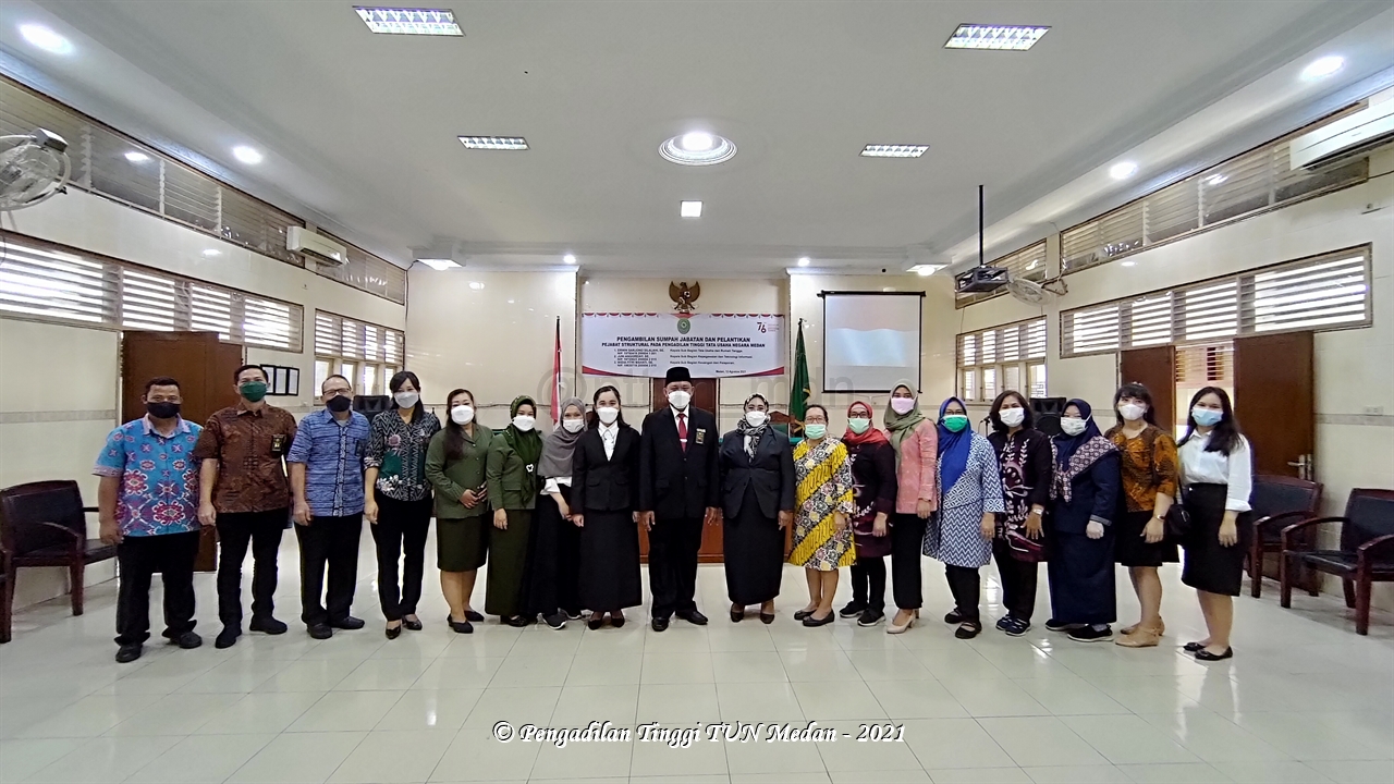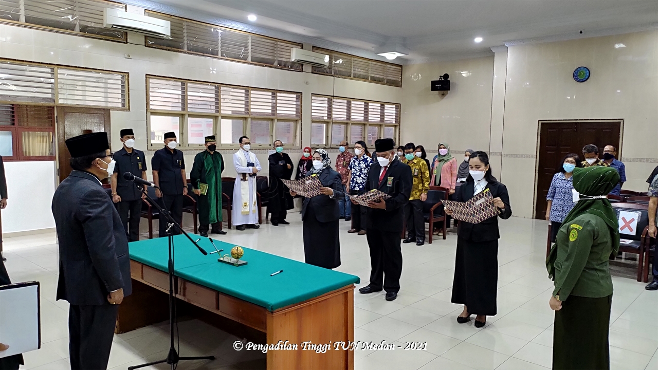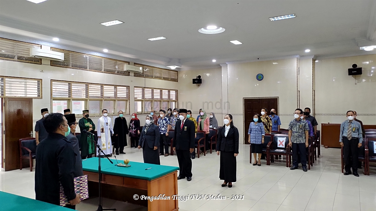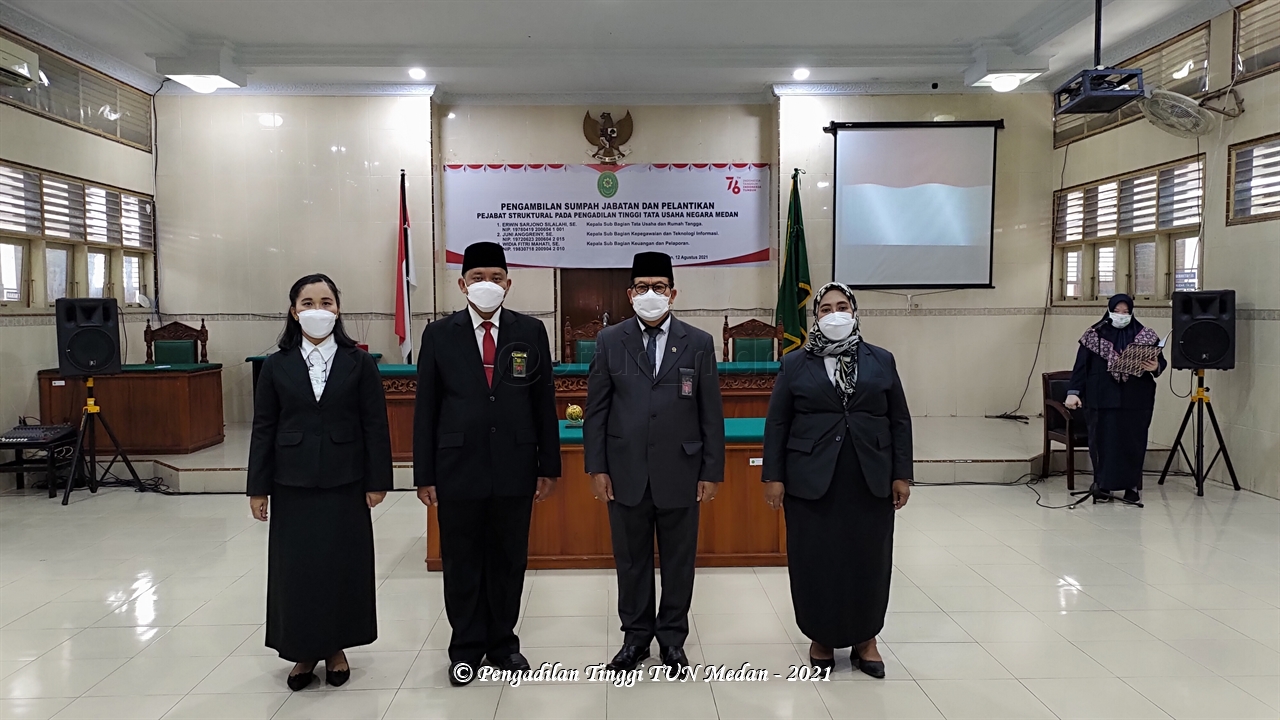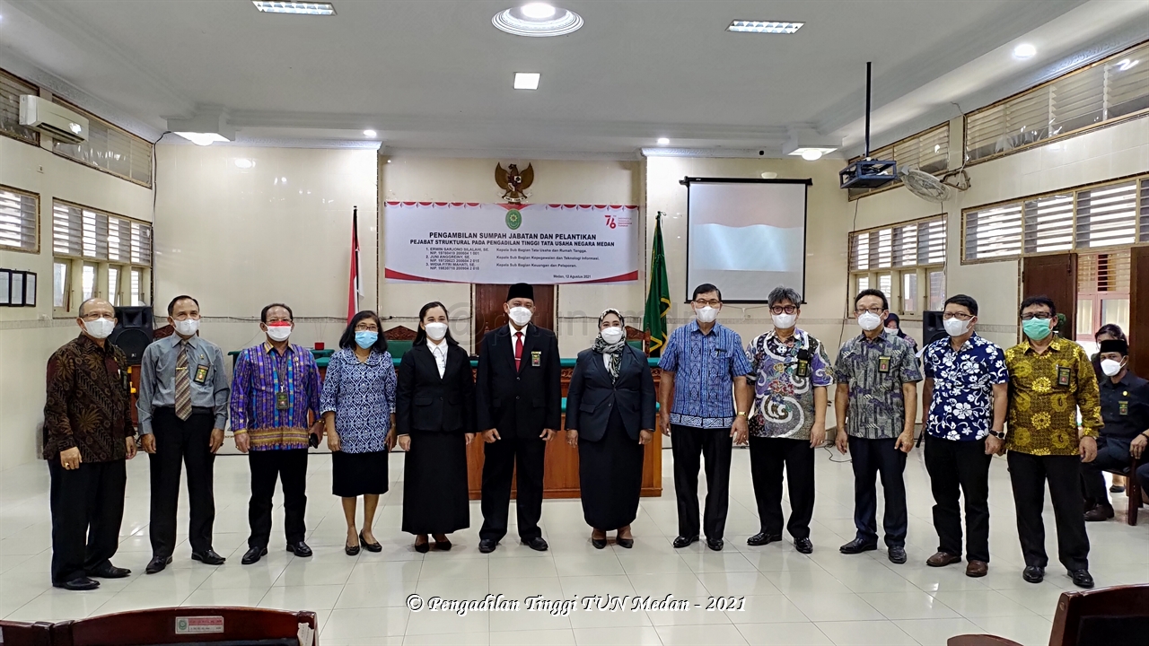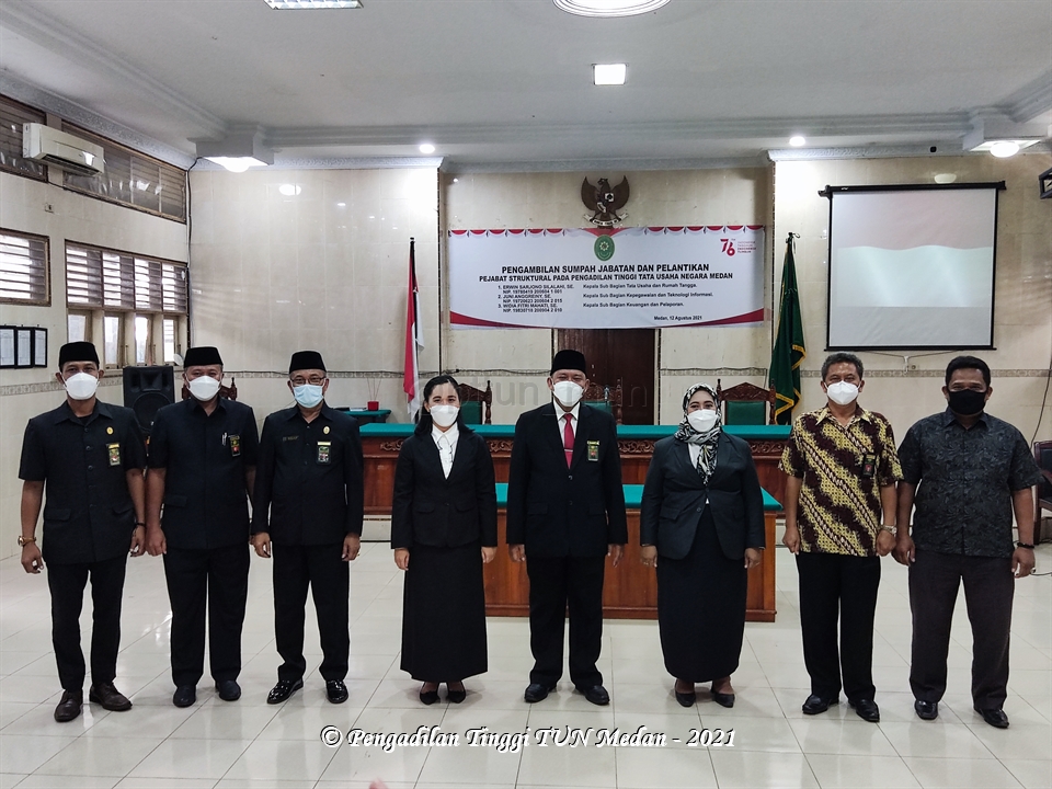 Pada Hari Kamis, 12 Agustus 2021, Pengadilan Tinggi Tata Usaha Negara Medan melaksanakan kegiatan Pengambilan Sumpah Jabatan & Pelantikan Kepala Sub Bagian di lingkungan Pengadilan Tata Usaha Negara Medan. Kegiatan tersebut dipimpin oleh Wakil Ketua Pengadilan Tinggi TUN Medan, Bapak Dr. Arifin Marpaung, SH., M.Hum., dan dihadiri oleh Hakim Tinggi, Pejabat Fungsional dan Struktural serta Pegawai ASN dan PPNPN. Acara berlangsung dengan tetap menerapkan Protokol Kesehatan sampai selesai dan diakhiri dengan foto bersama.