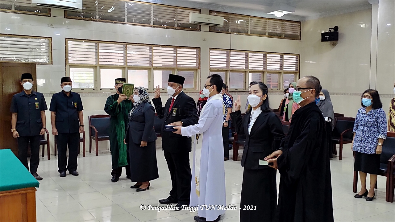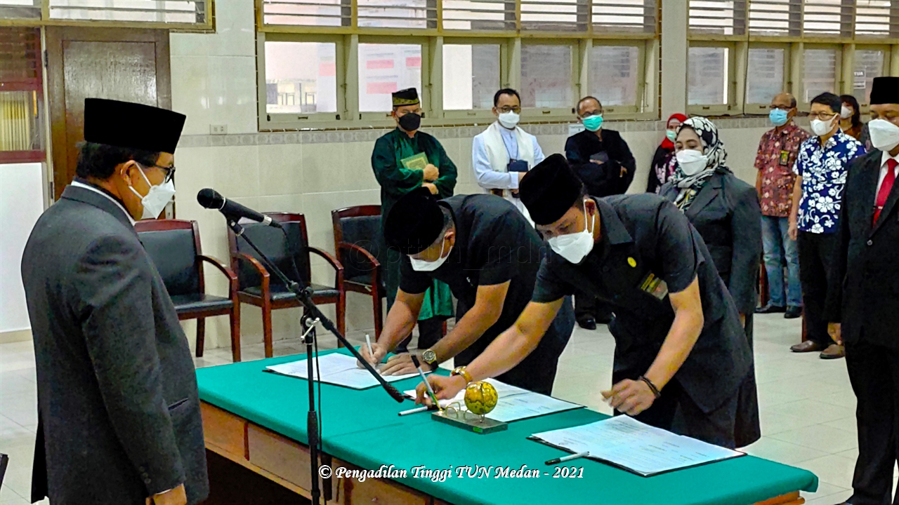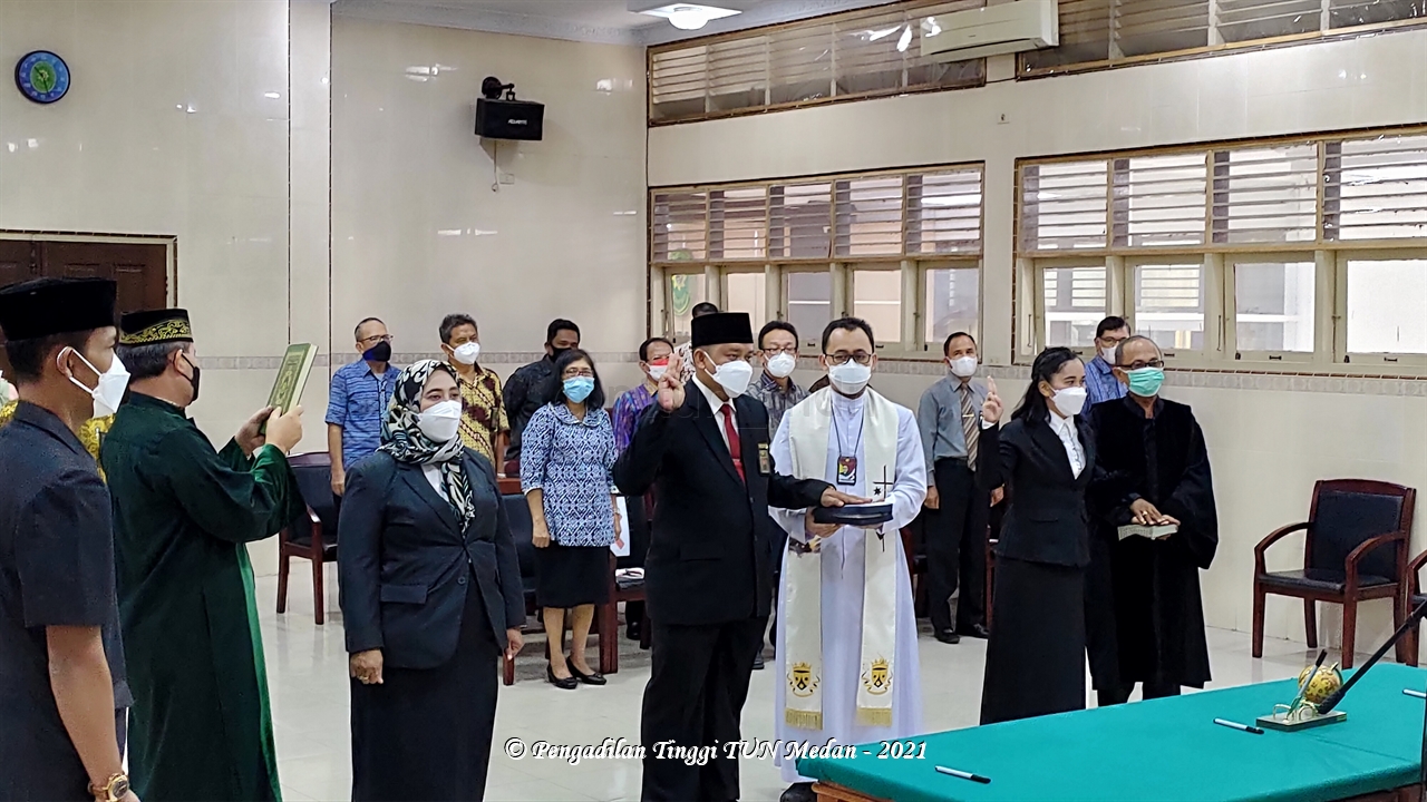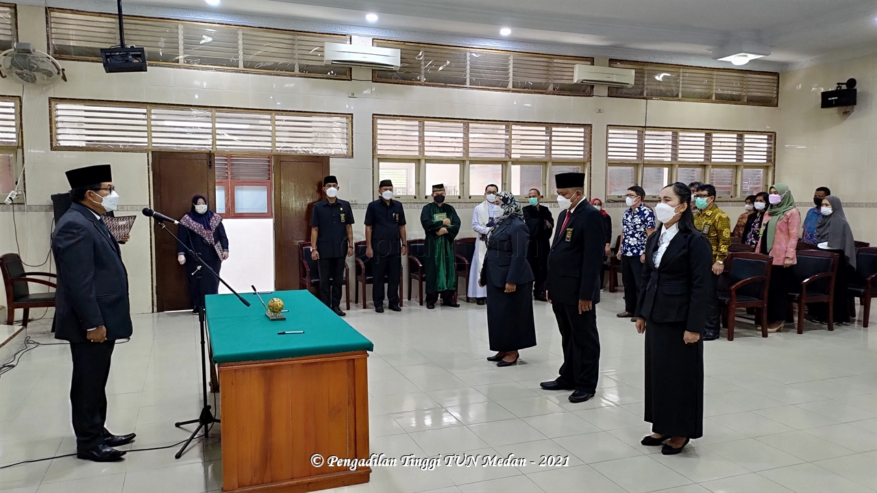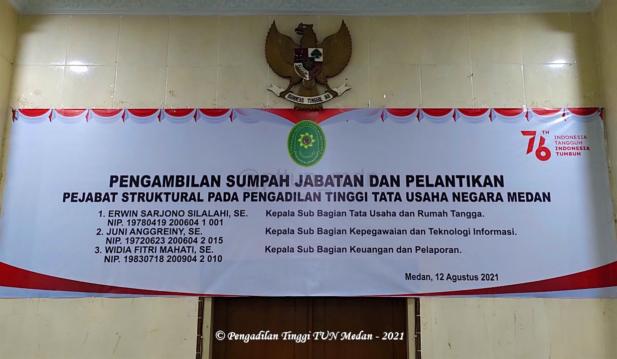 Pada Hari Kamis, 12 Agustus 2021, Pengadilan Tinggi Tata Usaha Negara Medan melaksanakan kegiatan Pengambilan Sumpah Jabatan & Pelantikan Kepala Sub Bagian di lingkungan Pengadilan Tata Usaha Negara Medan. Kegiatan tersebut dipimpin oleh Wakil Ketua Pengadilan Tinggi TUN Medan, Bapak Dr. Arifin Marpaung, SH., M.Hum., dan dihadiri oleh Hakim Tinggi, Pejabat Fungsional dan Struktural serta Pegawai ASN dan PPNPN. Acara berlangsung dengan tetap menerapkan Protokol Kesehatan sampai selesai dan diakhiri dengan foto bersama.