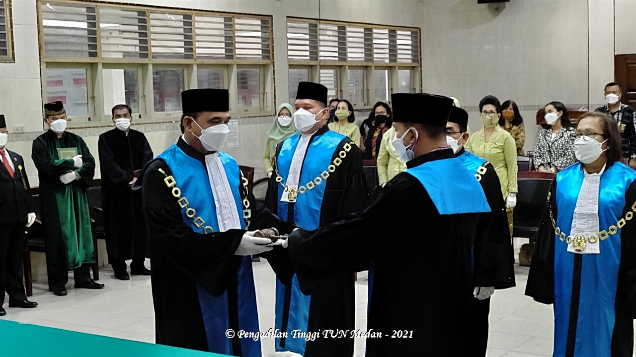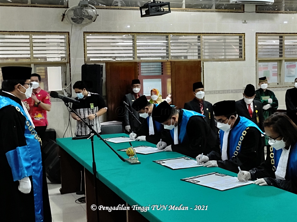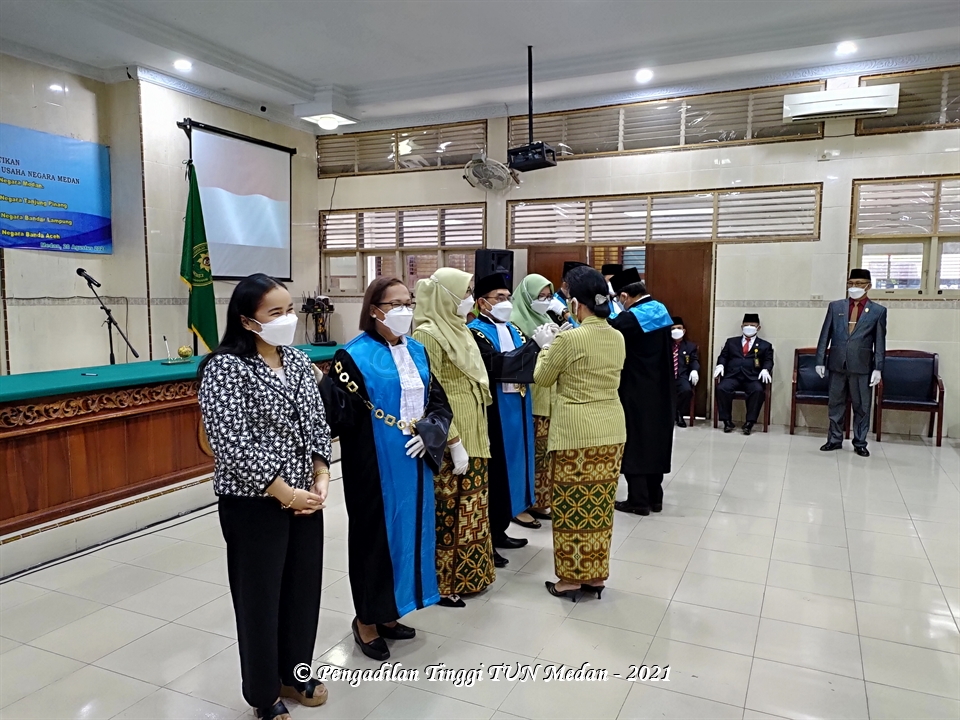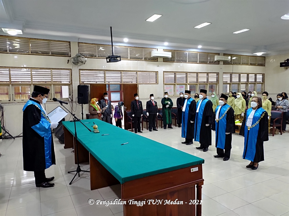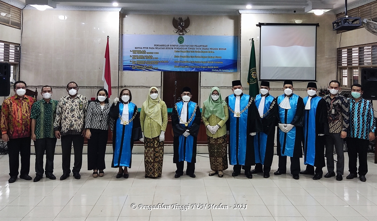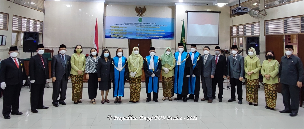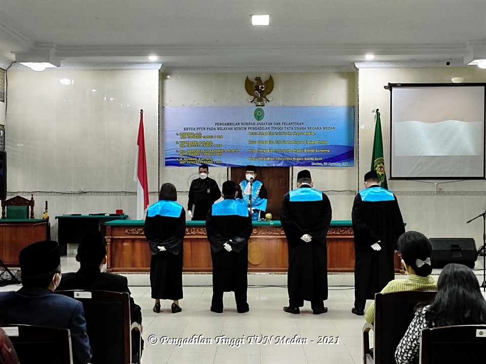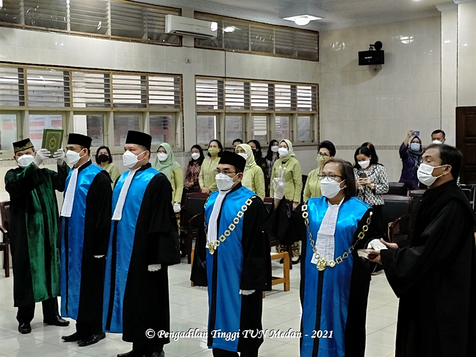 Pada Hari Jum’at, 20 Agustus 2021, Pengadilan Tinggi Tata Usaha Negara Medan melaksanakan kegiatan Pengambilan Sumpah Jabatan & Pelantikan Ketua PTUN pada Wilayah Hukum Pengadilan Tinggi TUN Medan. Kegiatan tersebut dipimpin oleh Plt. Ketua Pengadilan Tinggi TUN Medan, Bapak Dr. Arifin Marpaung, SH., M.Hum., dan dihadiri oleh Para Hakim Tinggi, Pejabat Fungsional dan Struktural serta Pegawai ASN dan PPNPN. Acara berlangsung dengan tetap menerapkan Protokol Kesehatan sampai selesai dan diakhiri dengan foto bersama.