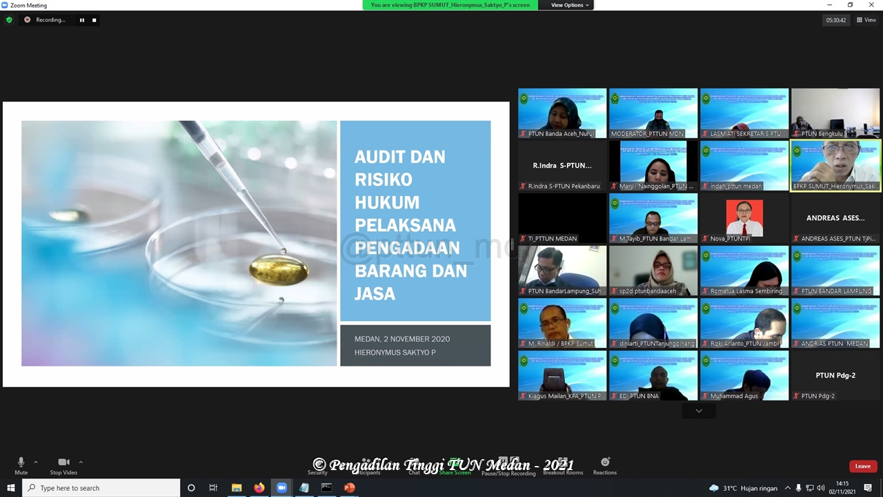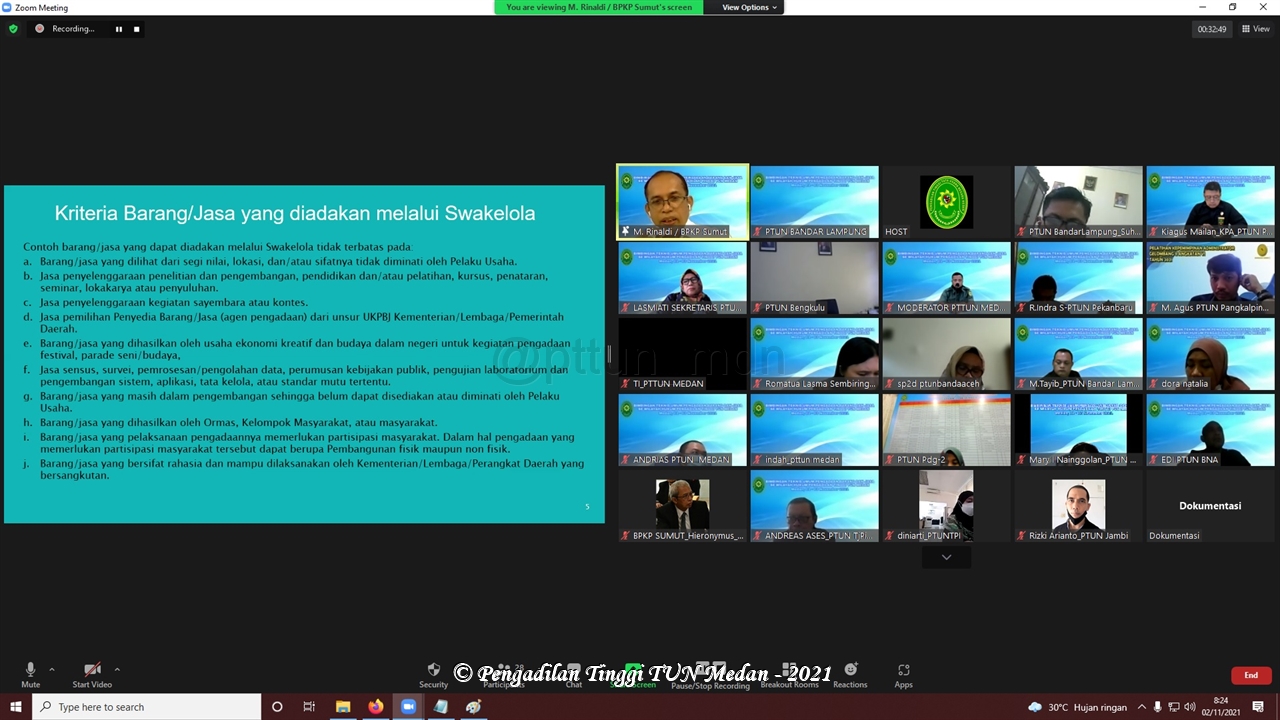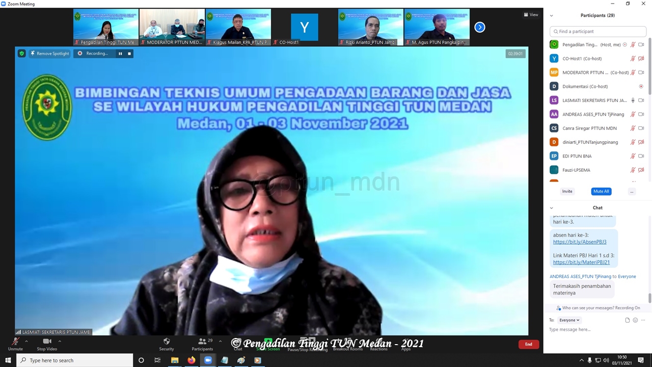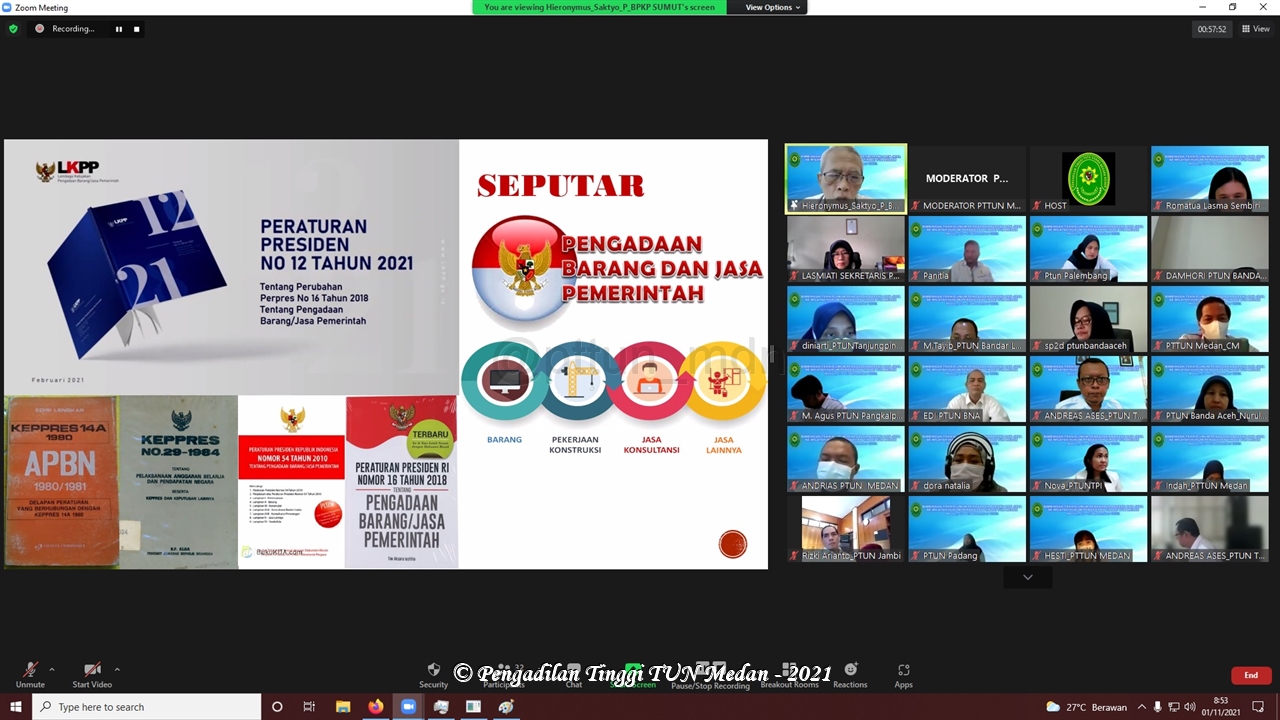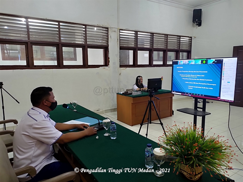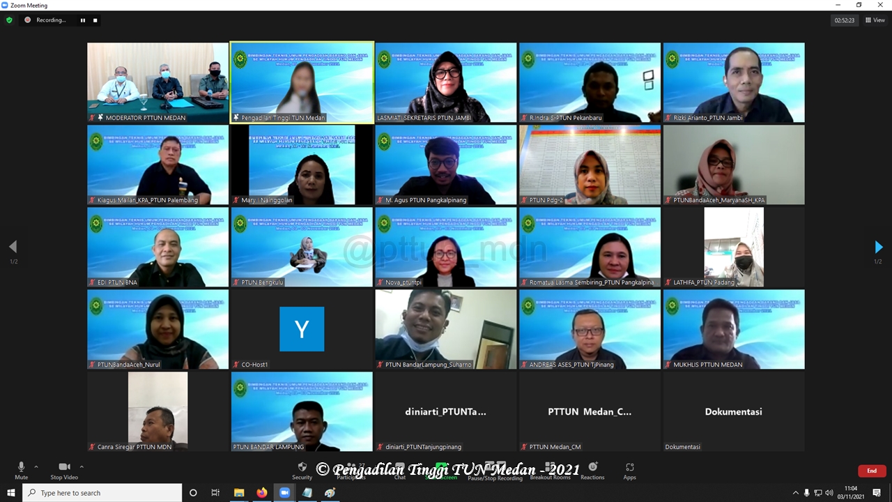 Pada Hari Senin s.d Rabu, tanggal 01-03 November 2021, Pengadilan Tinggi Tata Usaha Negara Medan melaksanakan kegiatan Bimbingan Teknis Umum Pengadaan Barang Dan Jasa secara virtual melalui Zoom Meeting.