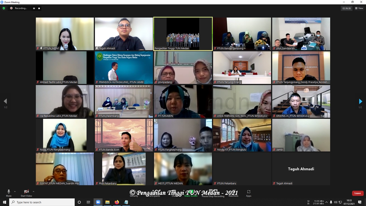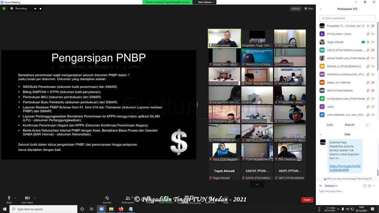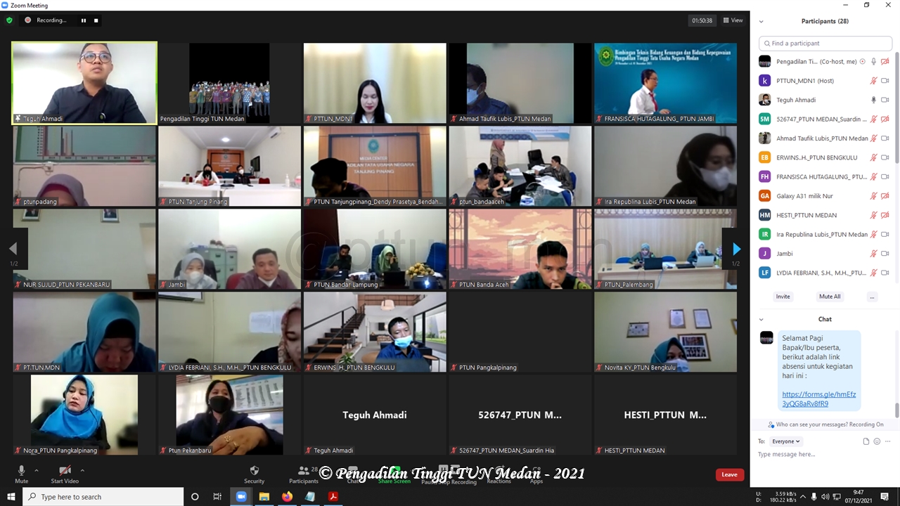 Pada Hari Selasa, 07 Desember 2021, Pengadilan Tinggi Tata Usaha Negara Medan melaksanakan kegiatan Sosialisasi PEnatausahaan dan Petunjuk Teknis PNBP secara virtual melalu Zoom Meeting, bertempat di Pengadilan Tinggi Tata Usaha Negara (PTTUN) Medan, Jl. Peratun Medan Estate, Kec. Percut Sei Tuan, Kab. Deli Serdang.