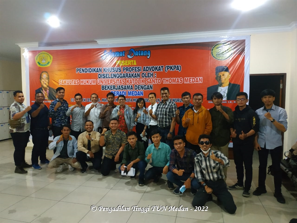 Pada Hari Jum’at, 11 Maret 2022, salah satu Hakim Tinggi pada Pengadilan Tinggi Tata Usaha Negara Medan yaitu Bapak A.K. Setiyono, S.H., M.H., memenuhi undangan sebagai pengajar dalam kegiatan Pendidikan Khusus Profesi Advokat (PKPA), yang bertempat di Gedung Universitas Katolik Santo Thomas Medan, Jl. Mataram No. 21, Kec. Petisah Hulu, Kota Medan.