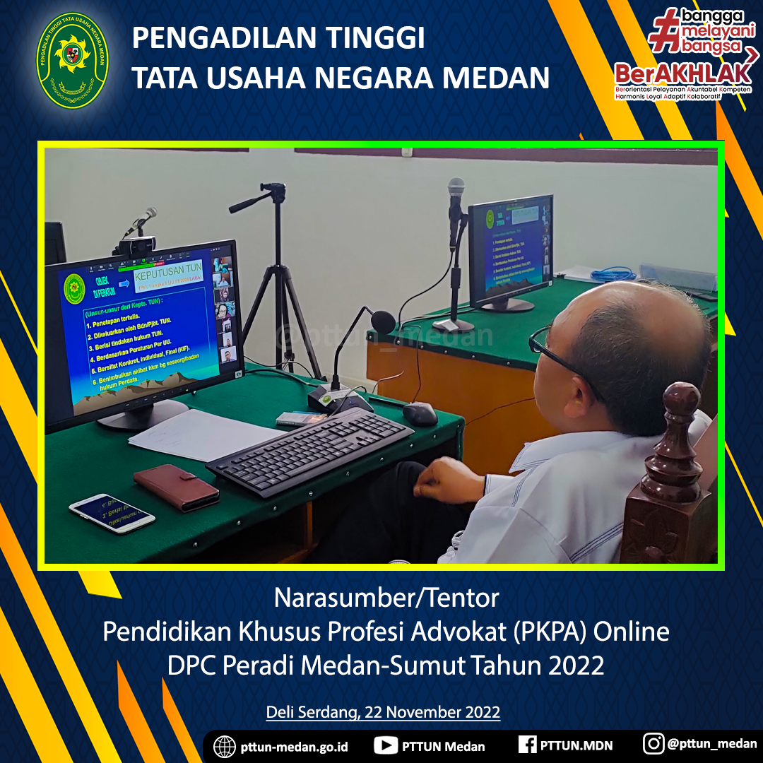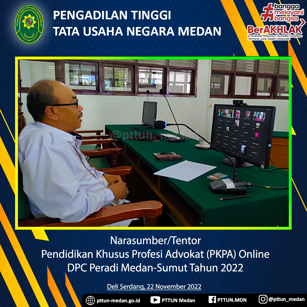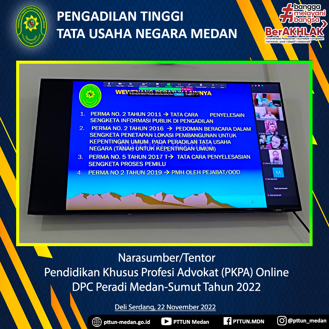 (Deli Serdang, 22/11/2022), Hakim Tinggi Pengadilan Tinggi Tata Usaha Negara Medan, Bapak Subur MS., S.H., M.H., memenuhi undangan sebagai narasumber pada kegiatan Pendidikan Khusus Profesi Advokat (PKPA) Online yang diselenggarakan oleh Dewan Pimpinan Cabang (DPC) PERADI Medan – Sumut pada hari Kamis, tanggal 22 November 2022.