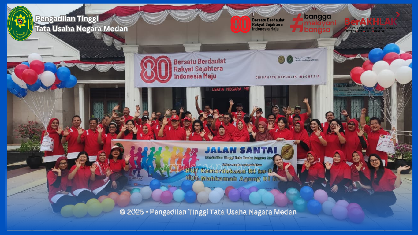 (Deli Serdang, 15/08/2025) – Dalam rangka memeriahkan HUT ke-80 Kemerdekaan Republik Indonesia, dan HUT ke-80 Mahkamah Agung Republik Indonesia, Pengadilan Tinggi Tata Usaha Negara Medan menggelar kegiatan jalan santai dan berbagai perlombaan khas tujuh belasan yang diikuti oleh seluruh keluarga besar Pengadilan Tinggi Tata Usaha Negara Medan.