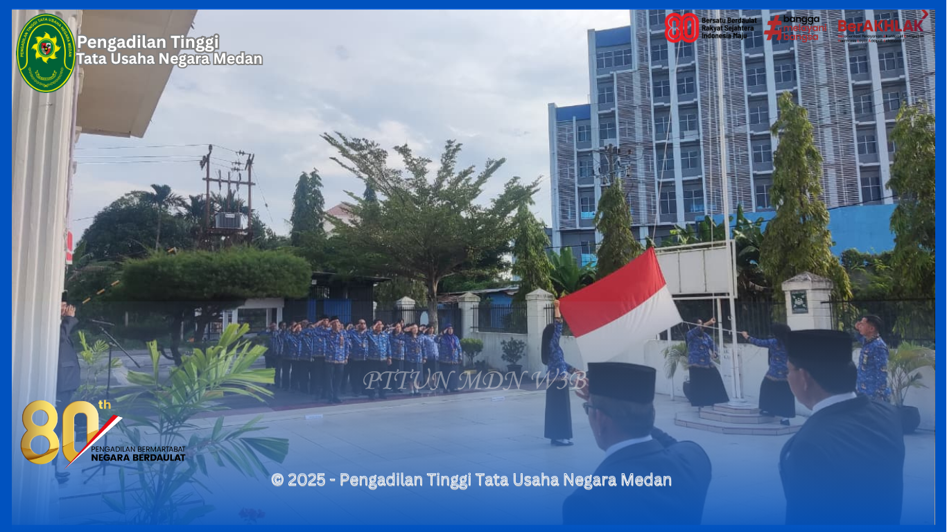 Ketua Pengadilan Tinggi Tata Usaha Negara, Bapak Dr. Disiplin F. Manao, S.H., M.H. sebagai Pembina Upacara, Sekretaris Pengadilan Tinggi TUN Medan, Bapak R. Indra Saputra, S.H., M.H. sebagai Perwira Upacara, dan bapak Cornelius M. T. Manullang, S.E., sebagai Pemimpin Upacara. Serta Aparatur Sipil Negara Pengadilan Tinggi Tata Usaha Negara, Sdri. Dedes Adawiyah Lubis, S.H., Sdri. Nur Azizah, S.Ak., dan Sdri. Samsuarni sebagai Pengibar Bendera. (WI/TIK)